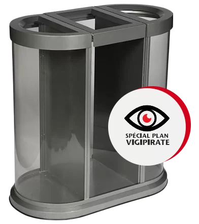 Poubelles de tri sélectif spécialement conçues pour encourager la séparation des déchets, design épuré et compact, en époxy/acrylique transparent, permettent une identification rapide du contenu dans le cadre du Plan Vigipirate.